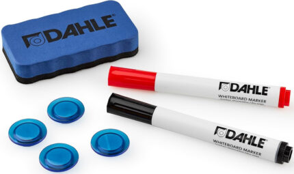 Set para pizarra blanca básico, compuesto por un borrador desechable azul , 4 imanes redondos diámetro 30 mm y 2