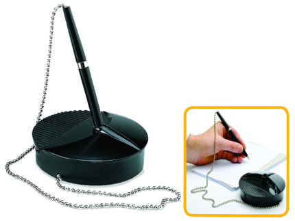Bolígrafo tinta negra unido a una pesada base de 300 g mediante una cadena cromada de 52 cm. Ideal para