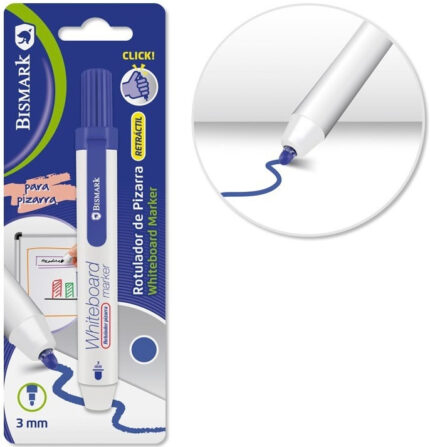 Rotulador para pizarra con pulsador y clip. Cuerpo plástico, punta redonda 3 mm. Medidas artículo: 1.8 x 14.7 cm.