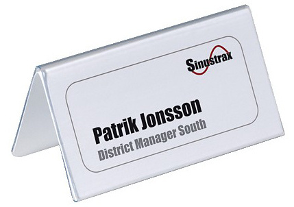 Portanombres fabricado en PVC rígido. Diseño en forma de tejado que facilita la lectura por ambos lados. Impresión sencilla con