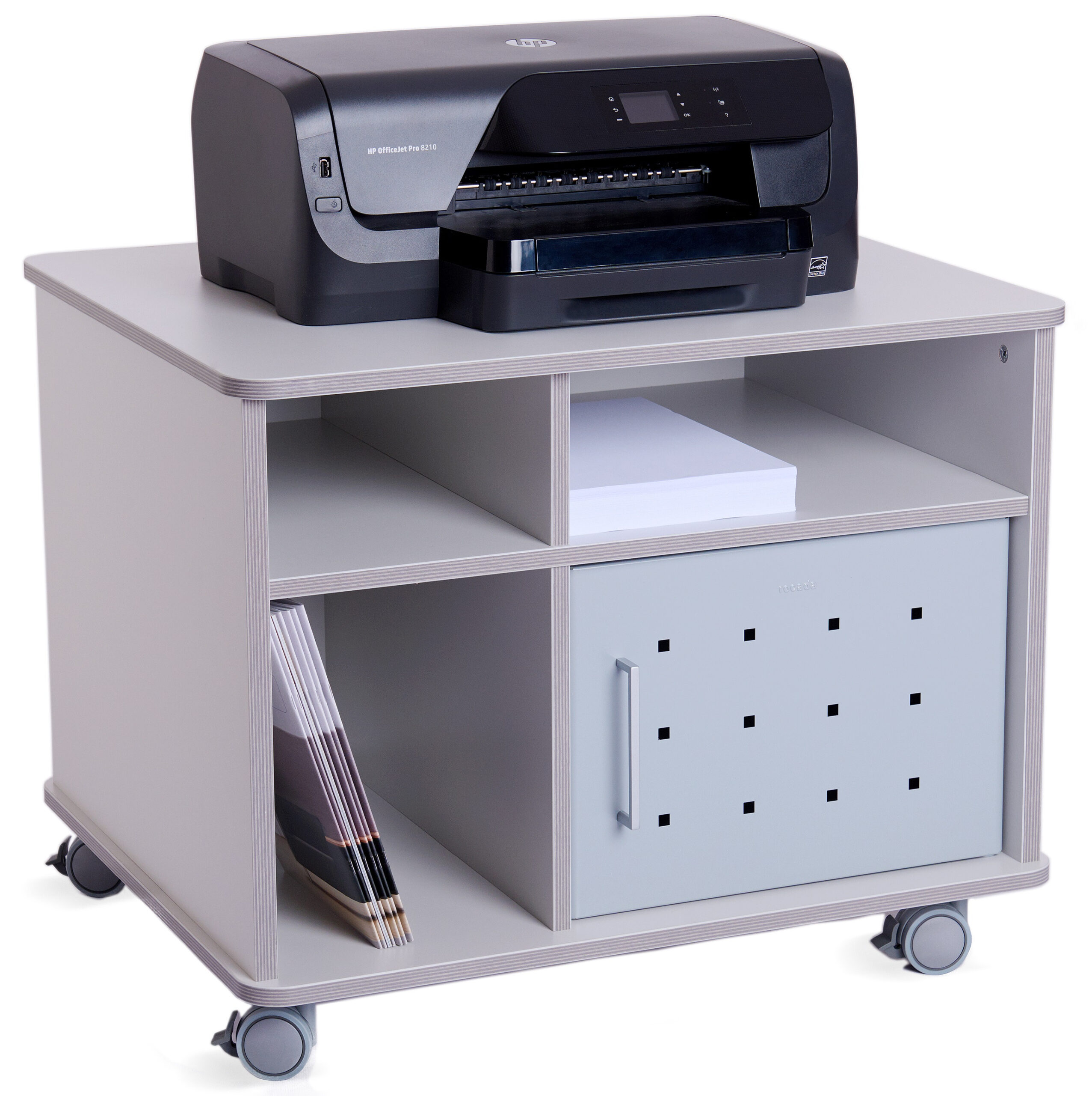 Mueble móvil gris de melamina de gran resistencia y diseño, útil como mesa auxiliar para impresora, fotocopiadora, fax, etc. Capacidad para documentos A4 y A3, dispone de puerta metálica de color aluminio, tirador de acero y ruedas con sistema de bloqueo. Fácil montaje.