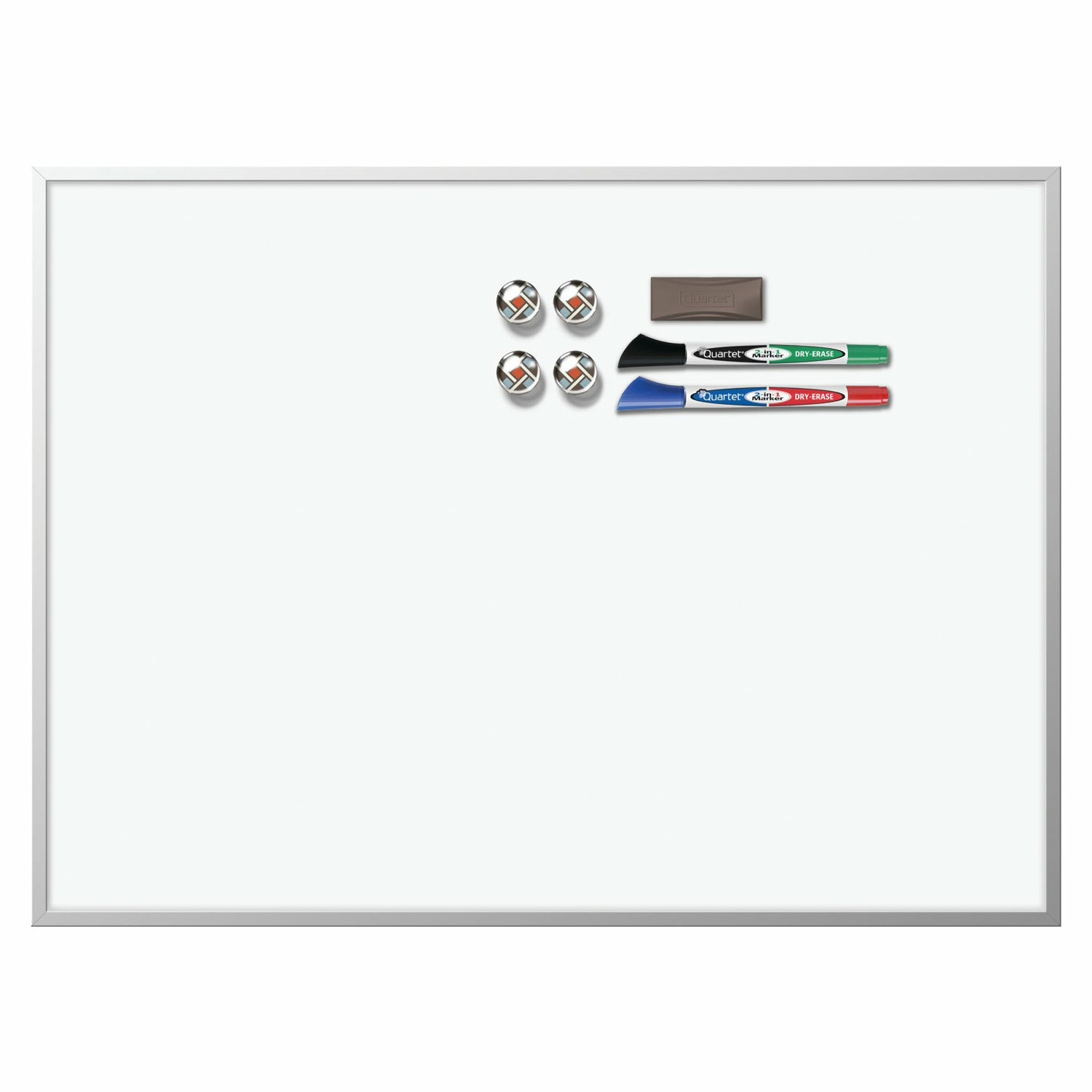 Pizarra magnética de borrado en seco con marco de aluminio. Ideal para el hogar. Incluye 2 rotuladores, 4 imanes y un mini borrador magnético. Puede montarse tanto vertical como horizontal. Medidas: 58.2 x 43 x 1.4 cm.