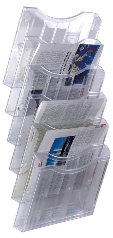 Fabricado en poliestireno transparente de gran calidad y resistencia. El conjunto sobresale de la pared entre 15 – 11.5 cm, excepto el modelo 6121M CS TP que queda totalmente pegado a la pared. El formato horizontal incluye 2 separadores por compartimento que permiten adaptarlo a diferentes formatos de papel. Se suministran completamente montados y se fijan fácilmente a la pared (kit de fijación incluido). Color cristal transparente. Fabricado en España.