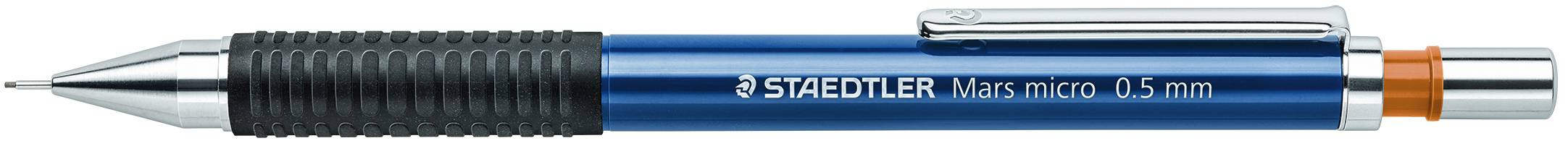 Portaminas para escribir y dibujar. Clip, pulsador y punta de metal. Empuñadura antideslizante de caucho. Cánula cilíndrica ideal para reglas y plantillas. Contiene minas HB y goma. Puntera retráctil.