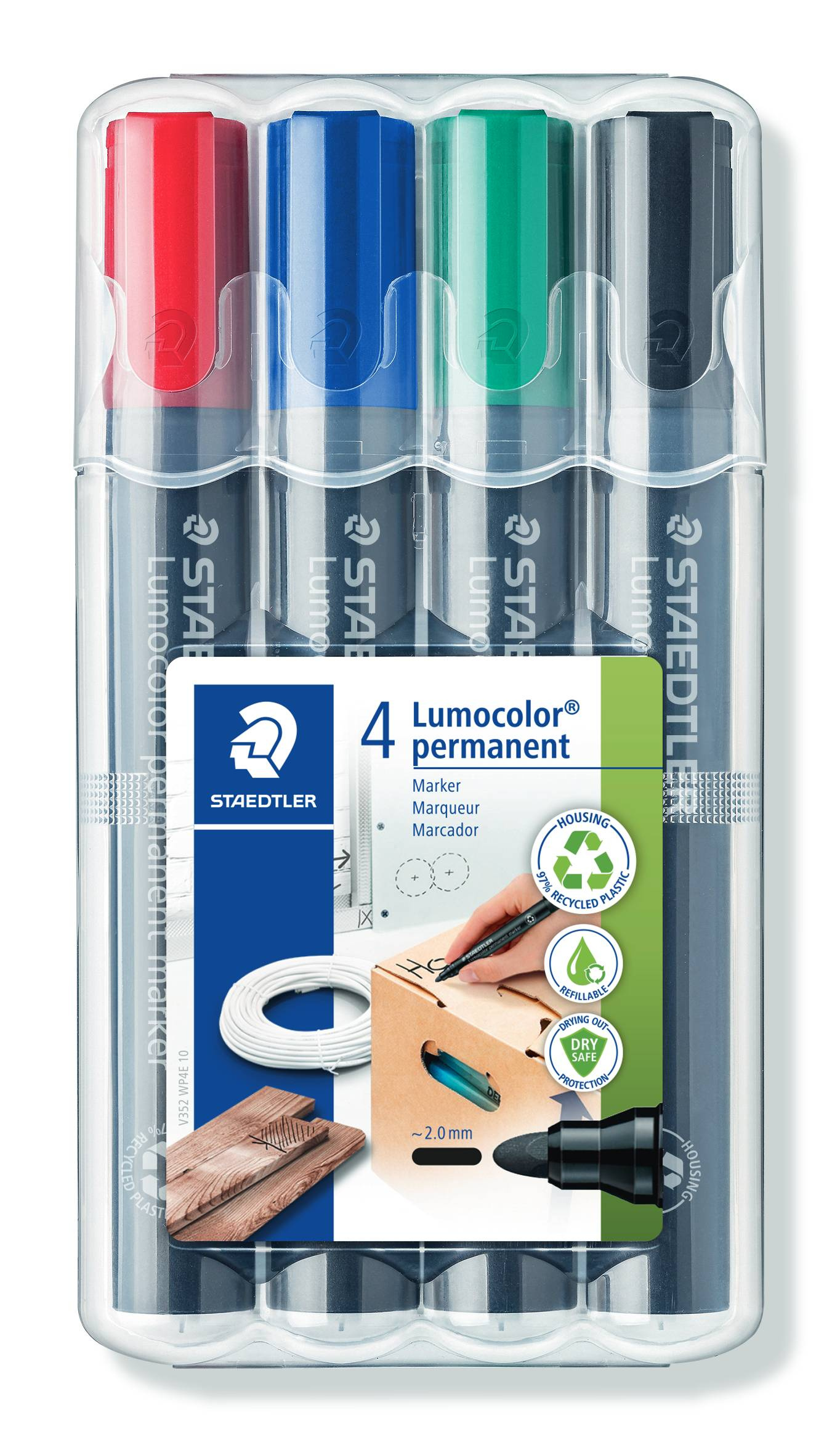 Permanente punta cónica. Carcasa fabricada en un 97% de plástico reciclado (cuerpo, capuchón y embellecedor) según ISO 14021. Con tinta con base alcohol, sin xileno, casi inodora. Apto para marcar sobre todas las superficies. Tinta revolucionaria: puede permanecer destapado durante días sin secarse. Capuchón del color de la tinta con clip. Secado rápido. Airplane safe (equilibrio automático de la presión de la tinta para evitar pérdidas durante el vuelo). Recargables. Trazo 2 mm.