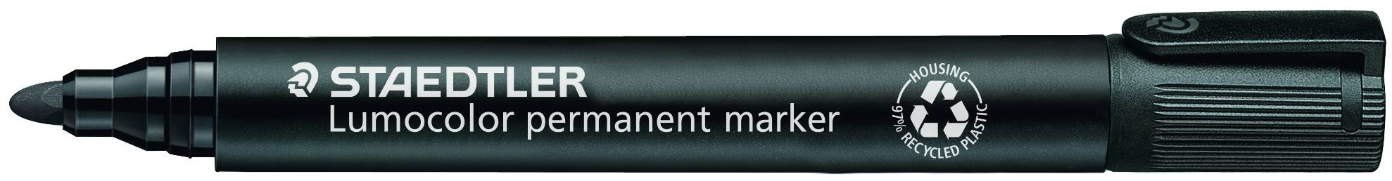 Permanente punta cónica. Carcasa fabricada en un 97% de plástico reciclado (cuerpo, capuchón y embellecedor) según ISO 14021. Con tinta con base alcohol, sin xileno, casi inodora. Apto para marcar sobre todas las superficies. Tinta revolucionaria: puede permanecer destapado durante días sin secarse. Capuchón del color de la tinta con clip. Secado rápido. Airplane safe (equilibrio automático de la presión de la tinta para evitar pérdidas durante el vuelo). Recargables. Trazo 2 mm.