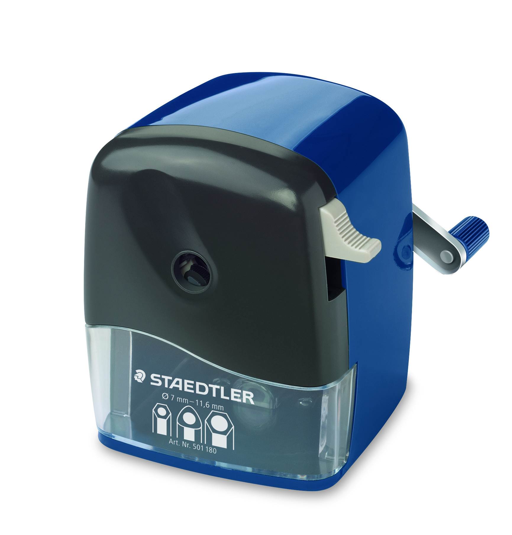 Máquina afilalápices para toda clase de lápices entre Ø7 y Ø11.6 mm, parada de afilado automática, con tornillo de fijación, cuerpo de plástico con carcasa de color azul, depósito transparente, sujeción del lápiz engomada. Envase individual.