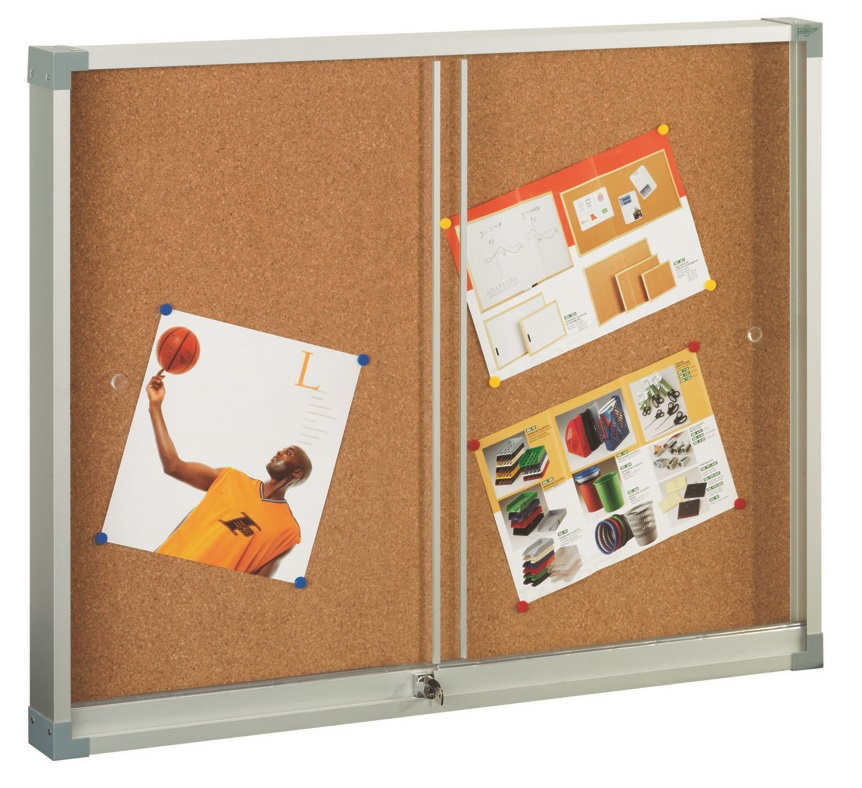 Vitrina de sólida estructura en aluminio anodizado y cantoneras decorativas. Puertas correderas de metacrilato mediante mecanismo deslizante de rodamientos. Suministrada con elementos de fijación. Cerradura con llave. Aconsejada para lugares de gran afluencia de público, por la seguridad en caso de rotura, que ofrece el metacrilato. Superficie de corcho de 5 mm de espesor y sólido soporte de madera aglomerada de 10 mm. 100% reciclable.